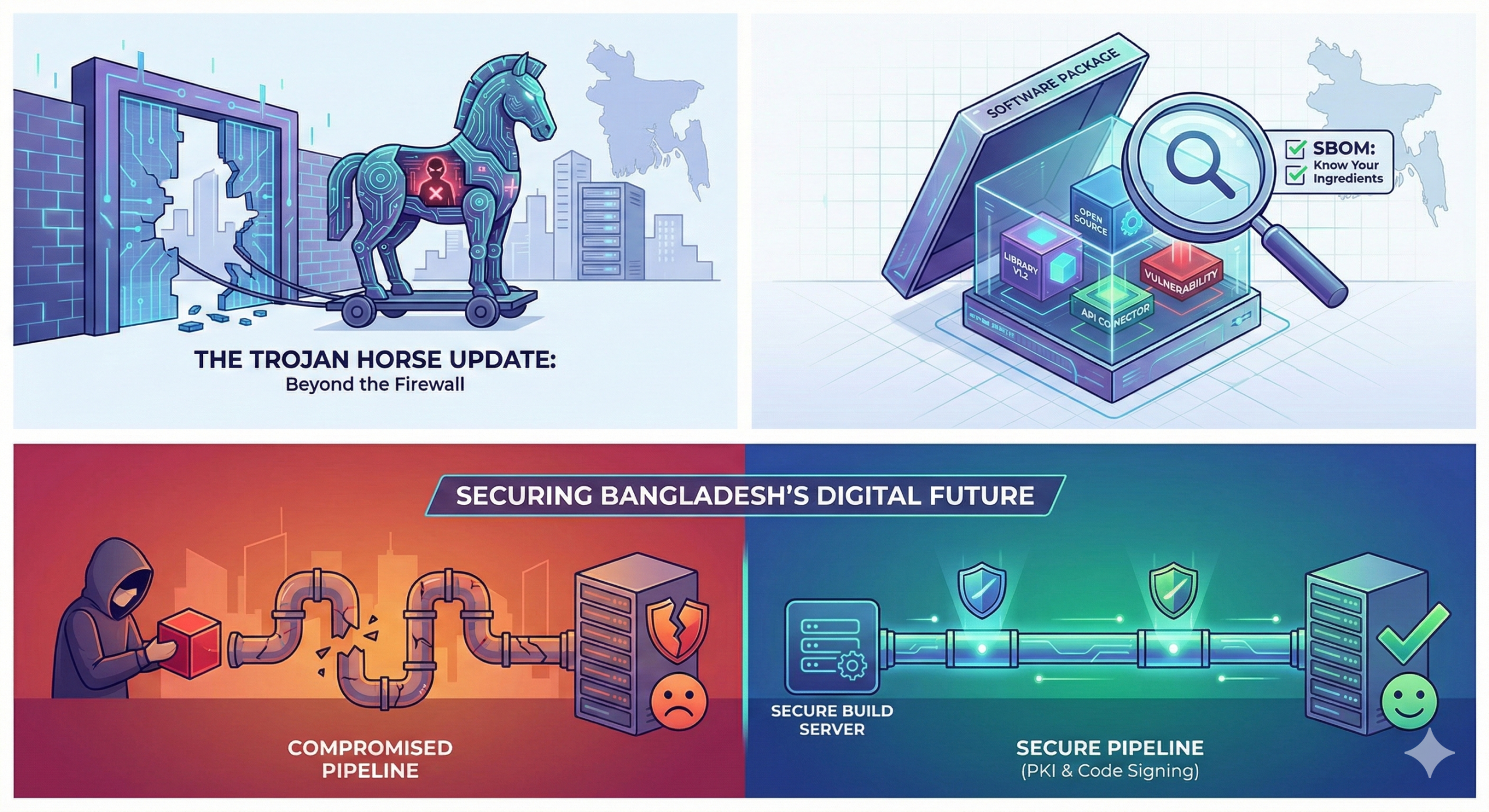 And this is the “Trojan Horse” of the modern era. With Bangladesh racing ahead towards the dream of a “Smart Bangladesh” through the transition of key infrastructure like government procurement (e-GP), banking, and citizen services into the cloud, we have no choice but to confront the unpleasant truth that a firewall is of no use if the software running behind it is already compromised even before the firewall is installed. It is time to look beyond the firewall and focus on software supply chain security.